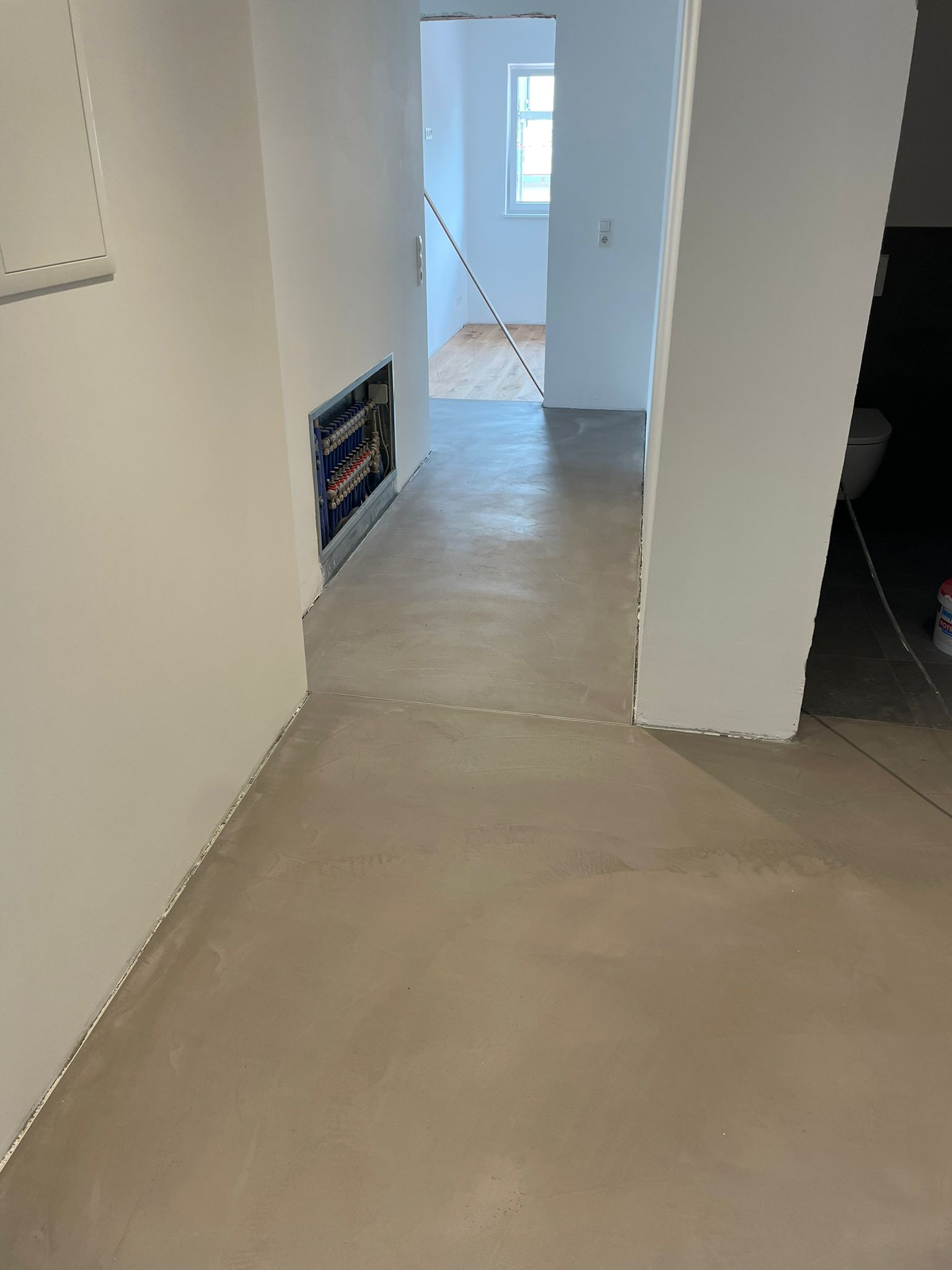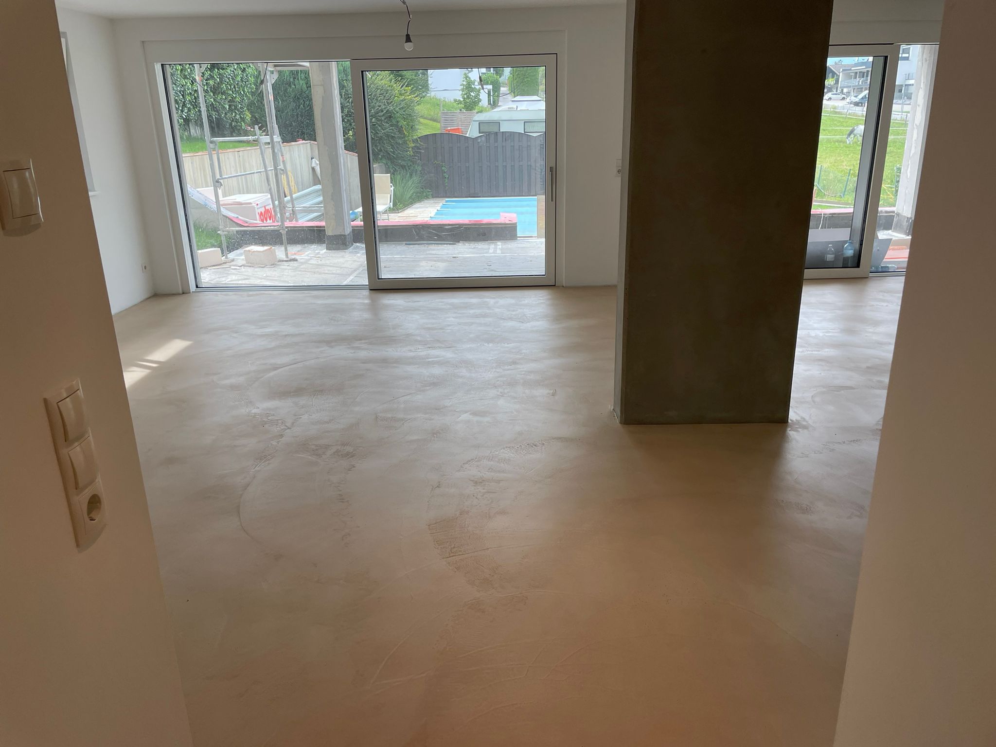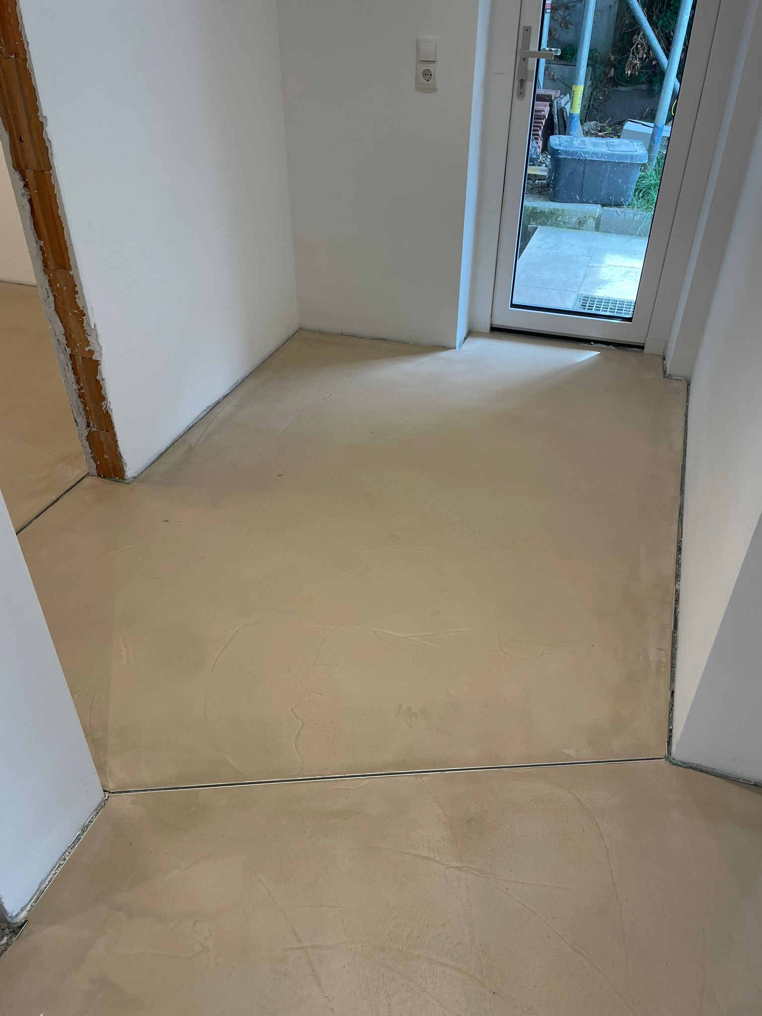 Stampflehmboden Aufbau mit integrierter Fußbodenheizung . Oberfläche geschliffen geölt und mittels Heißwachs vergütet